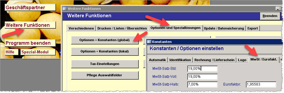 Einstellung der MwSt-SätzeDie MwSt-Sätze sind in den "Optionen + Konstanten (global) hinterlegt und einstellbar. Klicken Sie dazu im Hauptmenü auf "Weitere Funktionen",