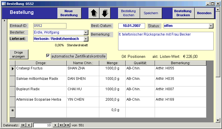 Eingabeformular für Bestellungen